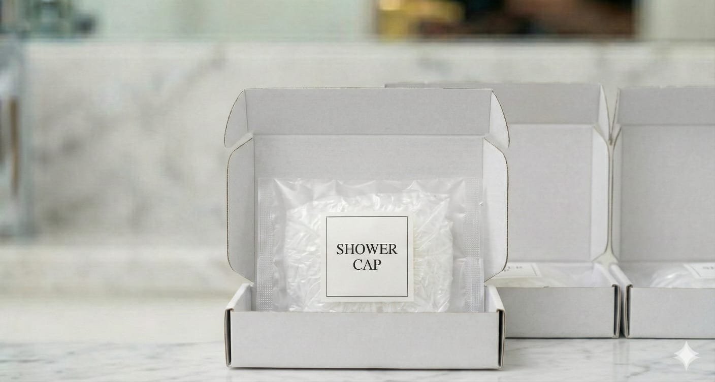 Provide guests with comfort, hygiene, and thoughtful convenience with our Disposable Shower Cap in box packing — a must-have amenity for hotels, resorts, guesthouses, serviced apartments, and spa facilities. These waterproof caps are designed to protect hair from water and moisture during showers or baths. Helping to guests to keep their hair dry while they enjoy a refreshing bath experience. Shower caps are a simple yet essential personal care accessory that enhances guest satisfaction and reflects professional hospitality standards.