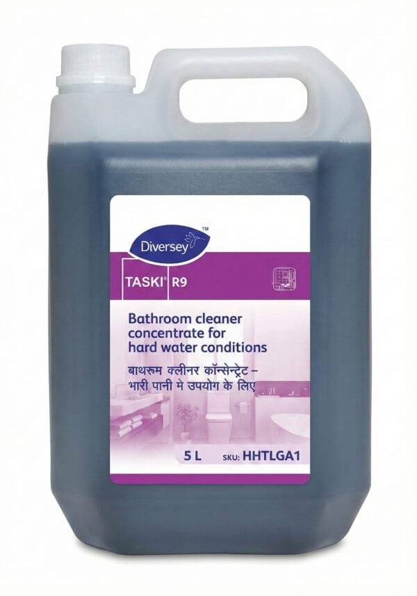 Diversey Taski R9 Bathroom Cleaner is a professional-grade bathroom cleaner concentrate designed for hospitality, housekeeping, and facility maintenance where hard water conditions are common. This 5 L bulk-size cleaning solution is ideal for hotels, resorts, guesthouses, and commercial spaces seeking efficient and reliable bathroom surface care.